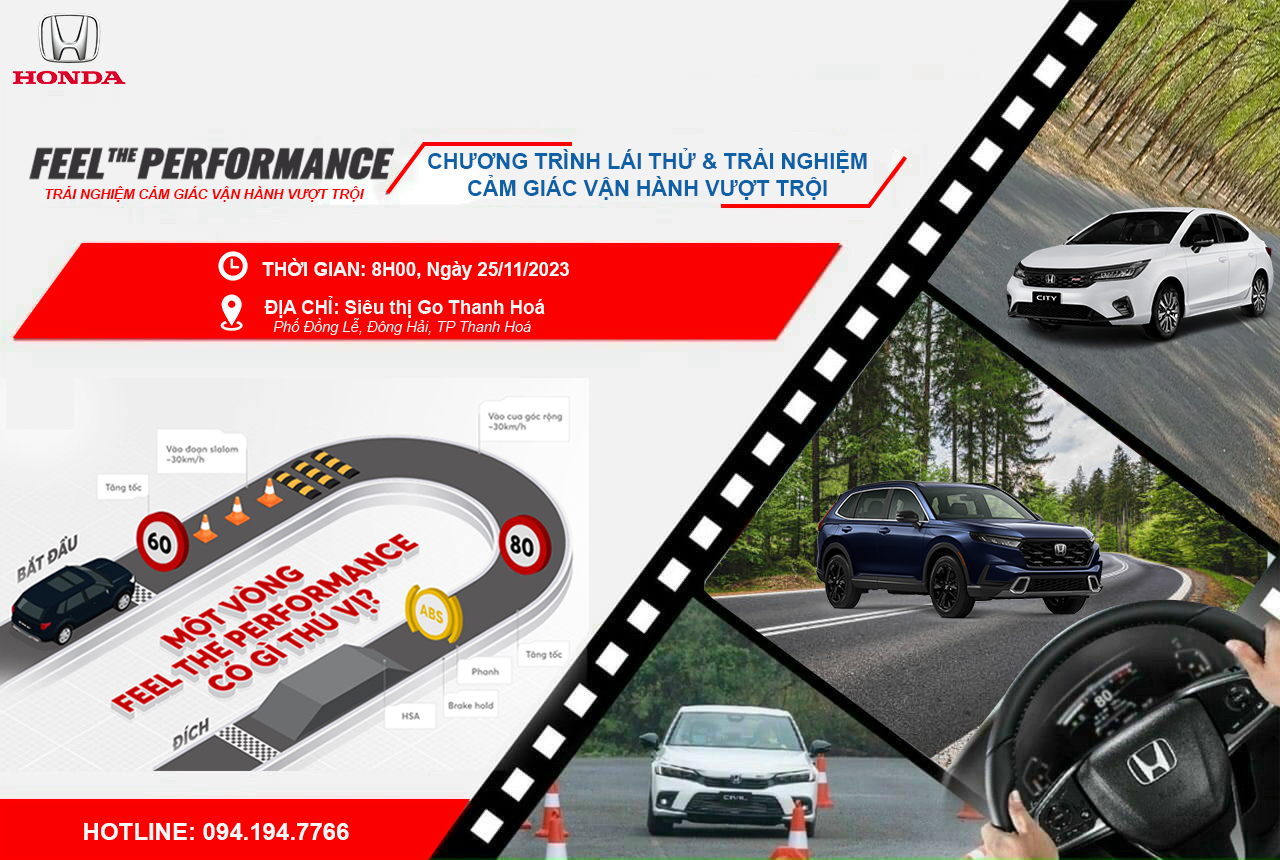Chiến dịch “Feel The Performance” với điểm nhấn là sự kiện lái thử đặc biệt do Honda Việt Nam phối hợp với Honda Ôtô Thanh Hóa tổ chức hàng tháng nhằm mở rộng cơ hội trải nghiệm các sản phẩm ô tô Honda cũng như lan tỏa niềm vui cầm lái đến nhiều hơn nữa khách hàng trên cả nước.