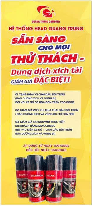 ÁP DỤNG TỪ NGÀY 15/07/2025 ĐẾN HẾT NGÀY 30/09/2025 Tặng ngay 01 chai dầu bôi trơn( Bảo dưỡng xích và vòng bi) đối với xe Số có hóa đơn trên 700.000đ. Giảm giá 20% khi mua chai dầu bôi trơn( Bảo dưỡng xích và vòng bi) chỉ còn 99k. Giảm giá 100.000vnd trực tiếp […]