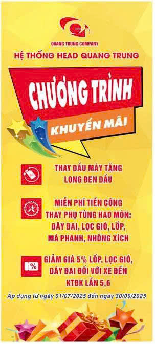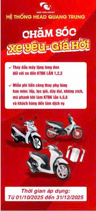 Thời gian: từ ngày 01/10/2025 đến hết ngày 31/12/2025 Thay dầu máy tặng long đen đối với xe đến KTĐK LẦN 1,2,3 Miễn phí tiền công thay phụ tùng hao mòn: Lốp, Lọc gió, Dây đai, Nhông xích, Má phanh khi làm KTĐK lần 4,5,6 và khách hàng đến làm dịch vụ. Đừng bỏ lỡ […]